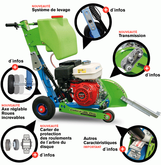 La Cobra 30 est une scie à sol rapide, légère et facilement maniable. Elle tolère des disques de 300 mm, 350 mm et 400 mm sur la même machine. Son design très innovant permet de rallonger les périodes d'entretien avec un gain de temps de 80% et une réduction importante des coûts d'entretient et temps d'arrêt de la machine.